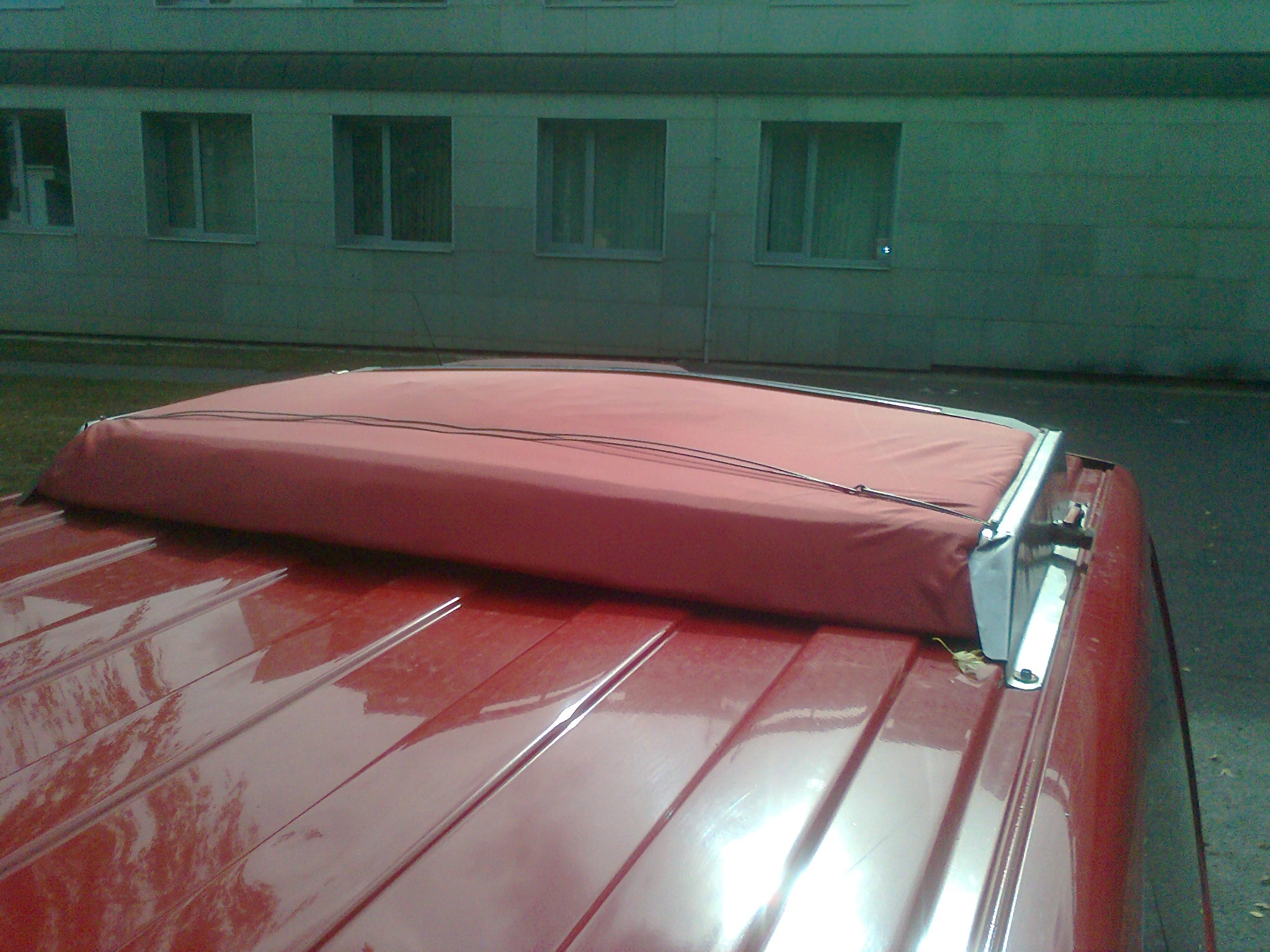 Základem je blok extrudovaného polystyrenu tl. 8cm v obalu ze silné umělé tkaniny, která je zespodu stahovaná tenkým gumicukem. Uprostřed je vyřezaná okrouhlá díra, ve které je vložen původní balon z rakve. Bočnice jsem zatím narychlo zohýbal z nerezového plechu ve svěráku, přišroubováno na fixpointy na střechu.