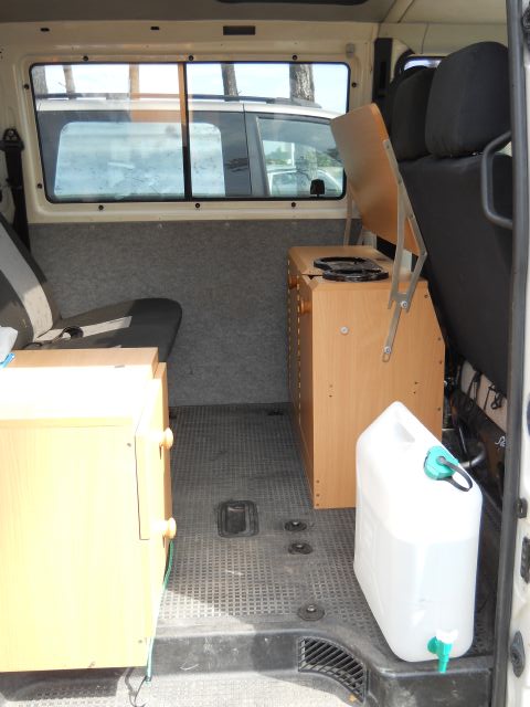 Díky tomu, je vše během 10minut demontováno a je z toho opět 9míst. bus. Prostřední řada sedaček je na přidané řadě špuntů posunuta dozadu, je to vlastně o šířku úchytů dozadu, aby se tam vešla "kuchyň"