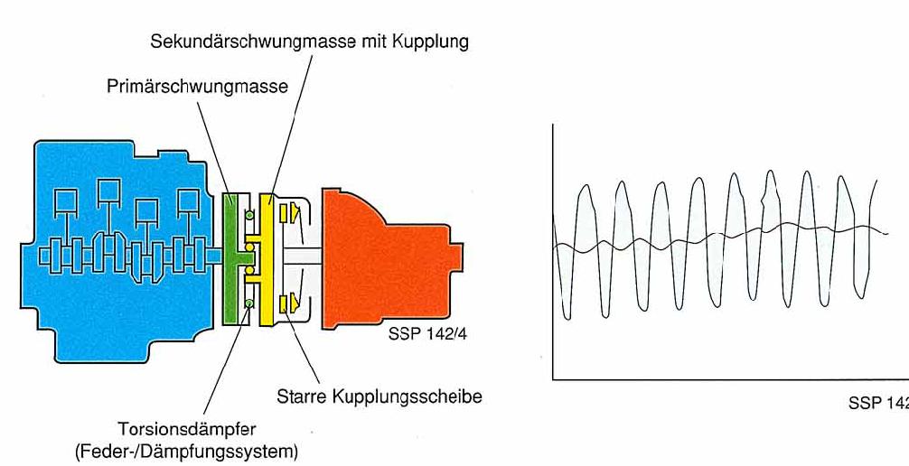 Obrázek 1 ukazuje klasické uspořádání se spojkou s torzním tlumičem. Graf ukazuje torzní kmity setrvačníku (větší amplitudy) a kmity na vstupním hřídeli převodovky. (menší amplitudy) . Požadavek je změnit poměry v převodovce tak aby nedocházelo k chrastění. Řešení je dvouhmotový setrvačník, jak už název říká, rozdělení hmoty setrvačníku na dva díly, primární jako doposud patří k momentu setrvačnosti klikovky, a sekundární, který zvyšuje moment setrvačnosti převodovky. Obě takto rozdělené hmoty jsou spojeny pružným systémem s tlumením. Zvýšenou hmotou, resp. zvýšeným momentem setrvačnosti rotačních dílů převodovky se posune vznik kmitů do podkritických otáček, takže chrastění převodovky – pokud vše v pořádku- se nemůže teoreticky vyskytnout.