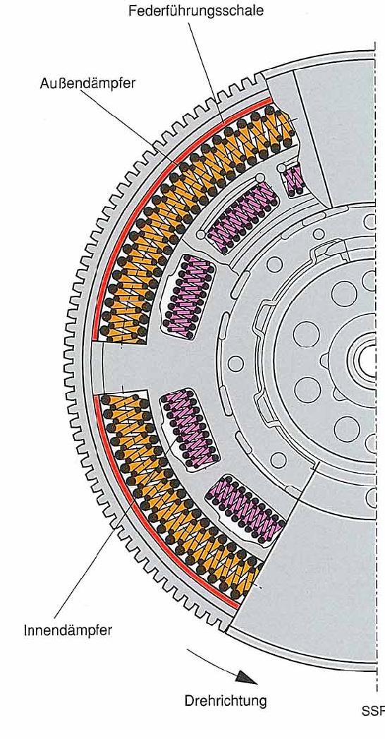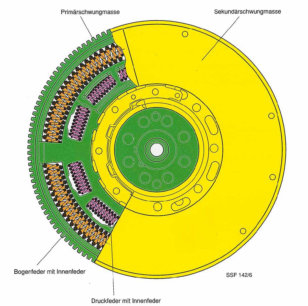 Primární část, zelená je svařená ze dvou dílů, ve které jsou pružinové pakety uloženy. Sekundární strana, žlutá je uložena na primáru kuličkovým ložiskem. Kroutící moment se z primáru na sekundár přenáší pružinovým svazkem. Spojka je našroubovaná na sekundáru. Elastické spojení primární a sekundární části je provedeno pomocí seriově spojeného vnějšího a vnitřního tlumiče, vlastní tlumení zajišťuje „Fettfüllung“ neboli náplň viskozního oleje, (hnědá barva), který svojí vysokou viskozitou funguje jako tlumení.