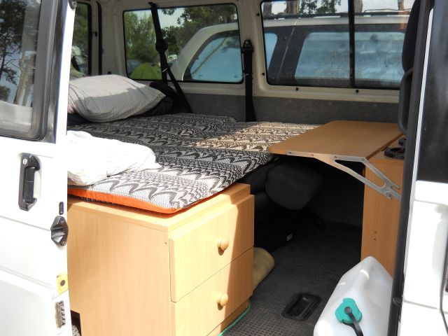 Díky tomu, je vše během 10minut demontováno a je z toho opět 9míst. bus. Prostřední řada sedaček je na přidané řadě špuntů posunuta dozadu, je to vlastně o šířku úchytů dozadu, aby se tam vešla "kuchyň" :D Tímto je spací délka 180cmx165cm. Pokud by to bylo pro někoho málo, je možné sklopit přídavný stolek a je tam skoro 3m! neměřil jsem to, nebylo třeba.